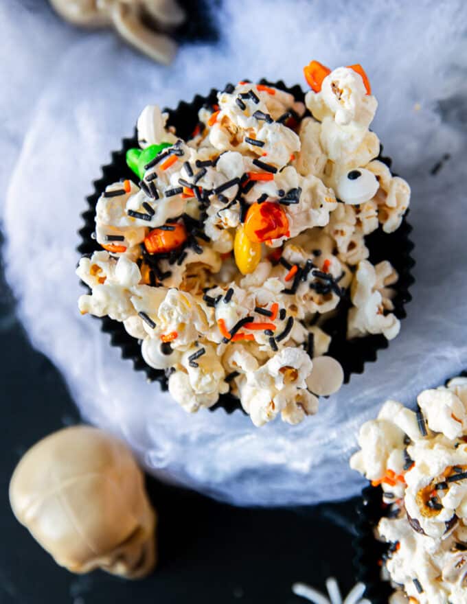 - Serve the halloween popcorn in small cups. We used silicone muffin cups, and we received them in black for a spooky vibe!