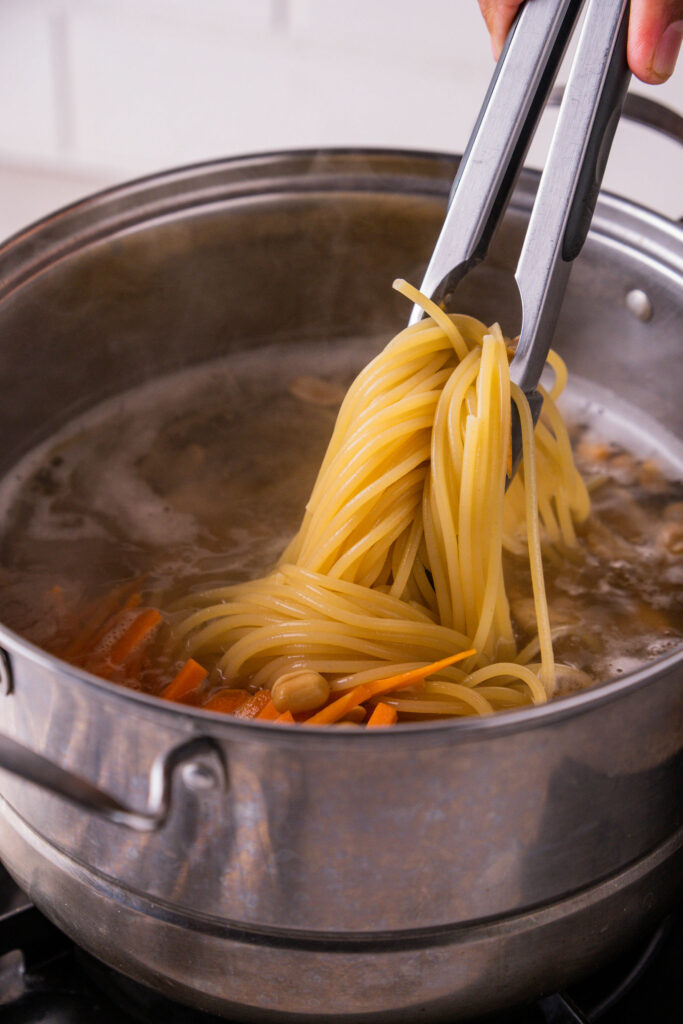 Start by cooking some pasta. I used entire wheat spaghetti, however soba noodles can be nice too!